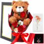 Rose Bouquet Gift with Bear Preserved Flowers 14 Inch Box with Rose Plush Bear Artificial Flower Necklace Greeting Card for Mother’S Day Wedding Anniversary Birthday Mom Girlfriend available at Acrossgifts.